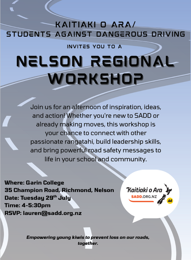 Contact Kerry for more information, kerry@sadd.org.nz